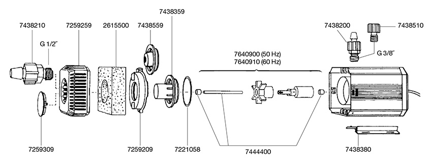 Es gibt 5 Modelle mit Leistungsstufen von 300 bis 3400 l/h, jeweils wahlweise mit 1,5 m (Innenbereich) oder 10 m (Außenbereich) Kabellänge. Außerdem eine kleine, flexible Hobbypumpe mit 270 l/h Pumpenleistung (siehe unten).