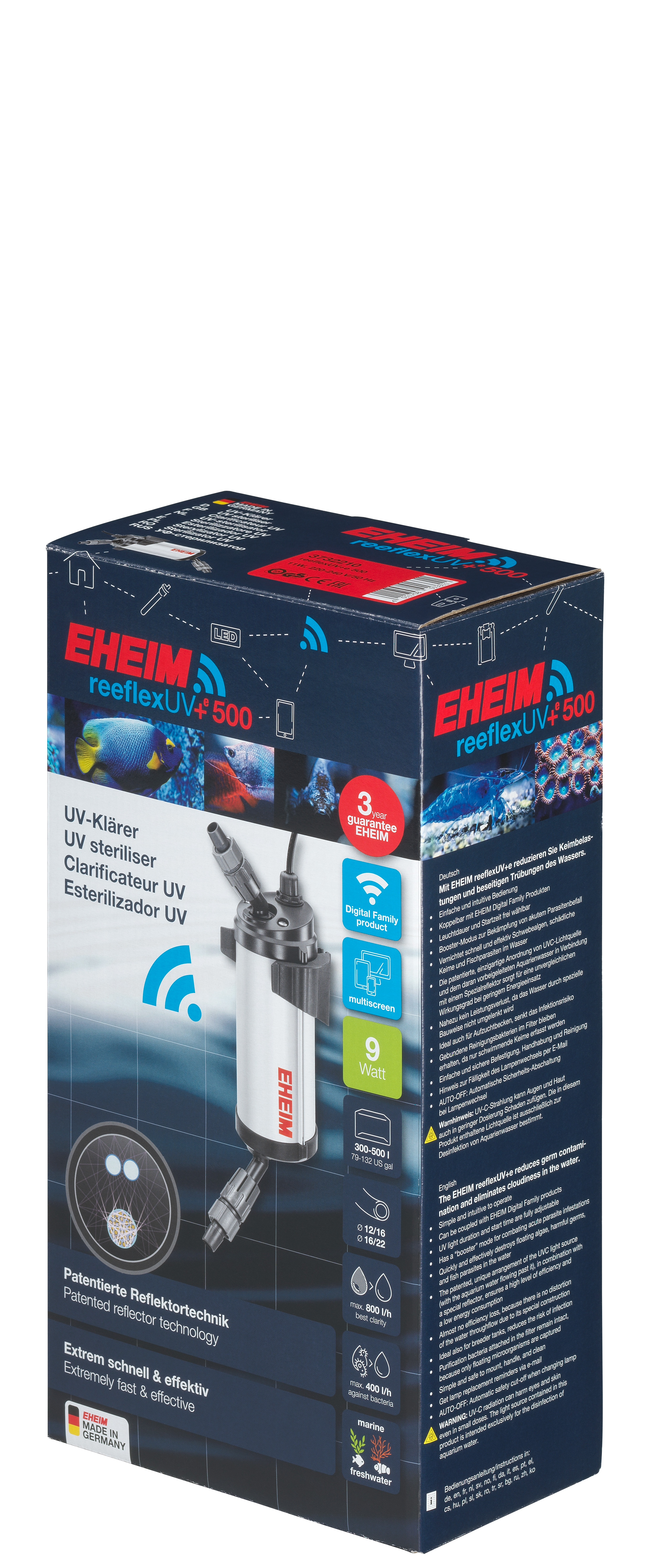 reeflexUV+e ist die WiFi-gesteuerte Weiterentwicklung des bewährten EHEIM UV-Klärers reeflexUV. Das Prinzip der patentierten Reflektor-Technik mit wesentlich verstärkter keimtötender UV-C-Strahlung ist dabei gleich geblieben. Während in herkömmlichen UV-Klärern das Wasser über Umwege am UV-C Brenner vorbeiströmt, nimmt es im EHEIM reeflexUV+e den direkten Weg. So entsteht kein Leistungsverlust und man spart Energie. Der Wirkungsgrad ist doppelt so gut. Der reeflexUV+e ist koppelbar mit Produkten der EHEIM Digital Familie und lässt sich per WLAN-fähige Endgeräte (Smartphone, Tablet, Notebook etc.) steuern. So können Sie z.B. verschiedene Modi wählen, Zeiten und Pausen bestimmen und bei starkem Parasitenbefall sogar in den Booster-Modus umschalten. reeflexUV+e sollten Sie unterstützend zum Filter einsetzen, um Kleinorganismen (Keime, Algensporen etc.) im Aquarium zu reduzieren.  Es gibt 4 Modelle für Aquarien von 300 bis 2000 Liter. Made in Germany.