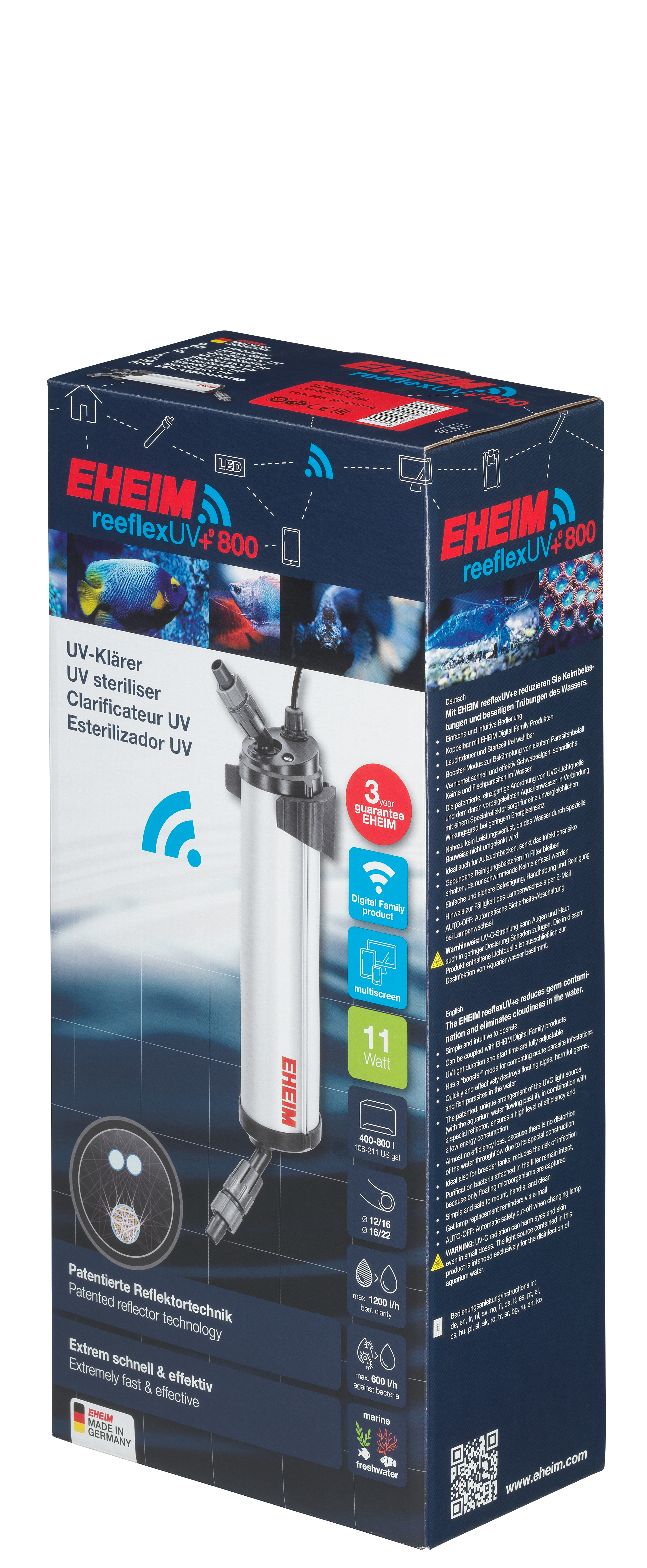 reeflexUV+e ist die WiFi-gesteuerte Weiterentwicklung des bewährten EHEIM UV-Klärers reeflexUV. Das Prinzip der patentierten Reflektor-Technik mit wesentlich verstärkter keimtötender UV-C-Strahlung ist dabei gleich geblieben. Während in herkömmlichen UV-Klärern das Wasser über Umwege am UV-C Brenner vorbeiströmt, nimmt es im EHEIM reeflexUV+e den direkten Weg. So entsteht kein Leistungsverlust und man spart Energie. Der Wirkungsgrad ist doppelt so gut. Der reeflexUV+e ist koppelbar mit Produkten der EHEIM Digital Familie und lässt sich per WLAN-fähige Endgeräte (Smartphone, Tablet, Notebook etc.) steuern. So können Sie z.B. verschiedene Modi wählen, Zeiten und Pausen bestimmen und bei starkem Parasitenbefall sogar in den Booster-Modus umschalten. reeflexUV+e sollten Sie unterstützend zum Filter einsetzen, um Kleinorganismen (Keime, Algensporen etc.) im Aquarium zu reduzieren. Es gibt 4 Modelle für Aquarien von 300 bis 2000 Liter. Made in Germany.