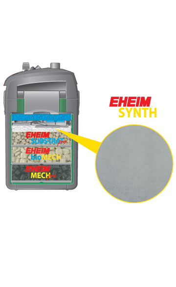 This fine fibre filter wadding once more cleans the water mechanically before re-entry into the aquarium. EHEIM SYNTH removes the finest dirt particles from the water, which are often responsible for turbidity in the aquarium. As the final filter layer EHEIM SYNTH should be used in a thin layer up to maximum 10 mm. After medication treatment a new layer of EHEIM SYNTH should be used.